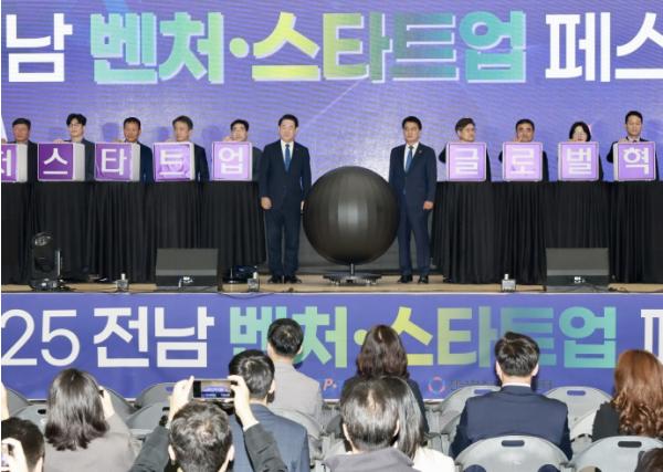 이날 전라남도 벤처.스타트업 페스티벌에는 지역 대학 총장, 초‧중‧고 대학생 등 3,000여 명이 참석한 가운데 사전공연, 비전영상 상영, 유공자 표창, 박람회장 시찰 순으로 진행됐다.