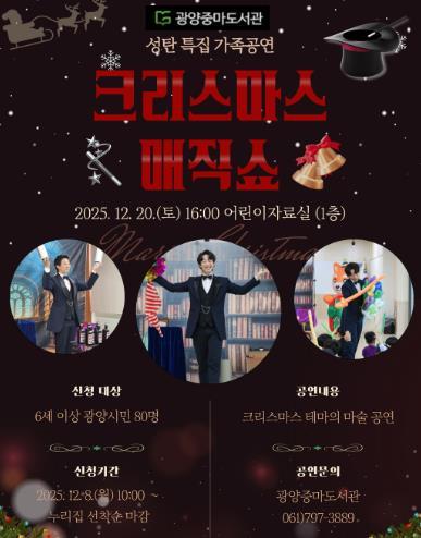 김현숙 도서관과장은 “아이들이 이번 공연을 통해 새로운 상상과 창의의 세계를 경험하고 마술의 원리를 탐구하는 재미를 느끼길 기대한다”며 “도서관을 찾은 가족 모두가 함께 웃고 공감하며 따뜻한 성탄의 추억을 만들어 가길 바란다”고 말했다.