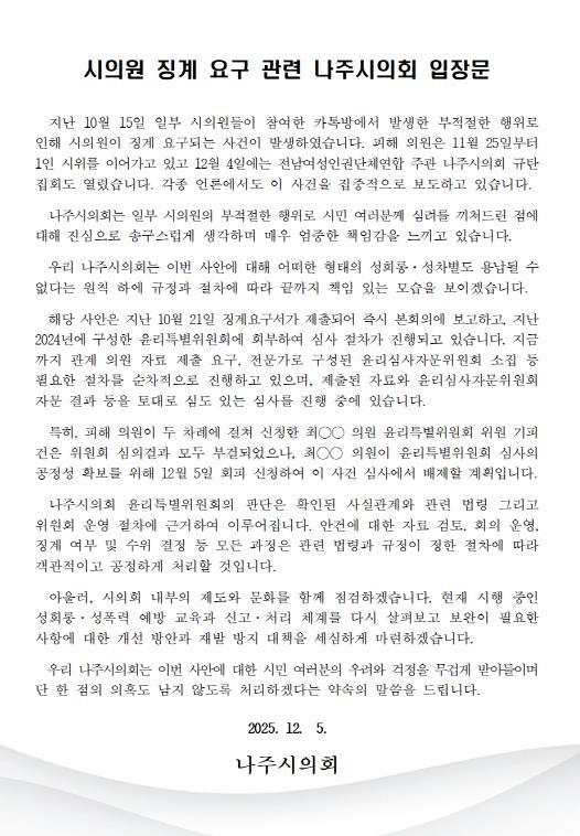 [중앙뉴스라인, 전은희기자] 나주시의회는 지난 10월 15일 일부 시의원들이 참여한 카카오톡 대화방에서 발생한 부적절한 행위로 징계 요구가 제기되고, 피해 의원의 1인 시위와 여성단체 규탄 집회, 언론 보도가 이어진 상황과 관련하여 12월 5일 공식 입장문을 발표했다.