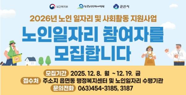 [중앙뉴스라인, 김용범기자] 군산시가 어르신들의 활기찬 노후생활과 사회참여 확대, 안정적 소득 확보를 지원하기 위한 '2026년 노인일자리 및 사회활동지원사업'참여자를 8일부터 19일까지 모집한다.