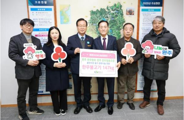 [중앙뉴스라인, 김용범기자] 전국한우협회 완주군지부·완주한우협동조합가 희망2026 나눔 캠페인을 맞아 지역 사회의 이웃들을 돕기 위해 500만 원 상당의 소불고기용 한우 147kg을 완주군에 기부했다.