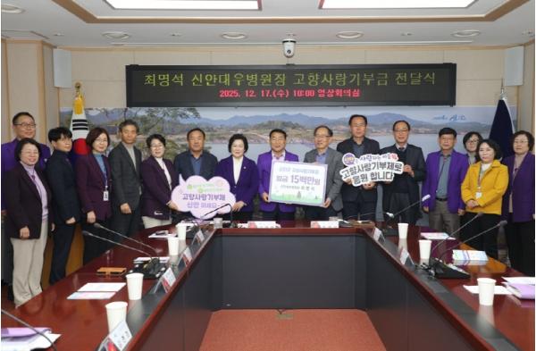 [중앙뉴스라인, 이상권기자] 신안군은 최명석 신안대우병원장이 고향사랑기부금 1,500만 원을 군에 전달했다고 17일 밝혔다. 이 기부금은 최 병원장이 최근 수상한 ‘김우중 의료인상’ 상금 중 일부다.