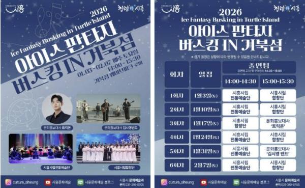 [중앙뉴스라인, 우제헌기자] 시흥시는 지난 연말에 진행된 ‘2025 시흥 사운드 오브 윈터’의 열기를 잇는 후속 문화예술 프로그램으로, 겨울철 거북섬을 찾는 시민과 관광객에게 풍성한 즐길 거리를 제공하고자 ‘2026 아이스 판타지 버스킹 인 거북섬’을 운영한다.
