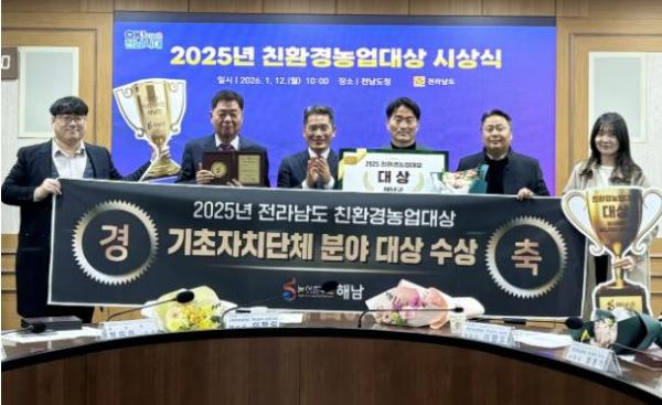 [중앙뉴스라인, 이상권기자] 해남군이 전라남도‘2025년 친환경농업대상’평가에서 대상을 수상했다. 2년연속 대상 수상으로, 우리나라 친환경농업 선도 지자체의 위상을 확고히 했다. 해남군은 상사업비 8,000만원도 확보했다.