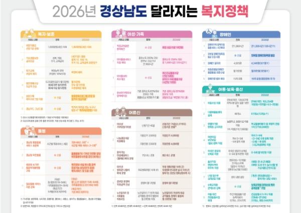[중앙뉴스라인, 한장원기자] 경상남도는 도민복지 향상과 취약계층 사회안전망 강화를 핵심으로 하는 ‘2026년 복지 분야 달라지는 시책’으로 6개 복지분야별 34개의 제도와 지원계획을 발표했다.