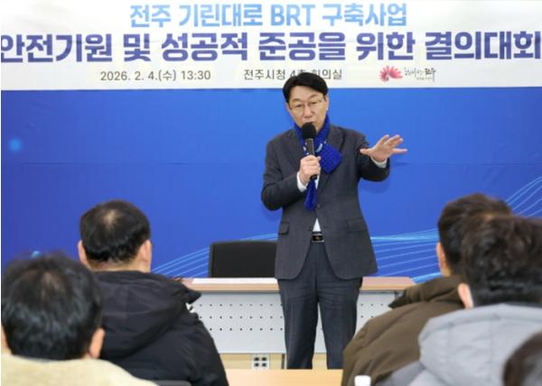 시는 4일 전주시청 회의실에서 우범기 전주시장과 공사 현장 도급사 관계자와 건설 관계자 등 50여 명이 참석한 가운데 ‘전주 기린대로 BRT 구축사업 안전기원 및 성공적 준공을 위한 결의대회’를 개최했다.