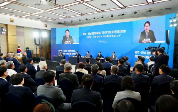 광주광역시와 전라남도는 4일 오후 해남문화예술회관 다목적실에서 서남권 시·도민 120여명이 참석한 가운데 ‘광주·전남 행정통합 서남권 타운홀미팅’을 개최했다.