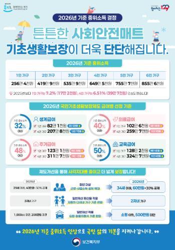 2026년 기준중위소득(국민 가구소득의 중간값으로 복지사업을 선정하는 기준)은 4인 가구 기준 649만 4천738원으로 지난해보다 6.51% 인상됐다.