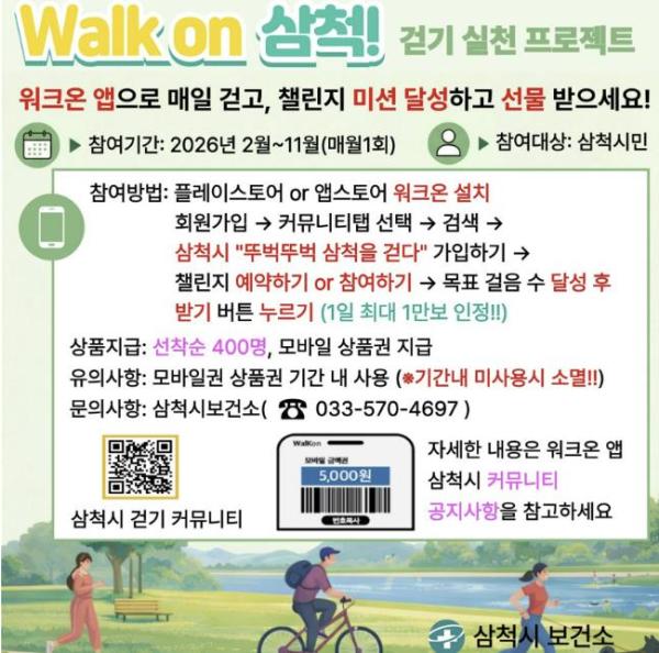 [중앙뉴스라인, 한소연기자] 삼척시는 시민들의 건강 증진과 일상 속 걷기 실천율 향상을 위해 모바일 걷기 앱 '워크온(Walk On)'을 활용한 ‘워크온 걷기 챌린지’를 오는 2월부터 11월까지 운영한다.