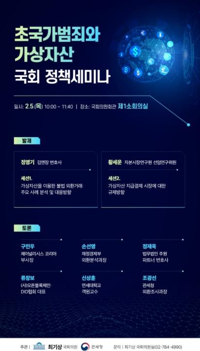 [중앙뉴스라인, 우제헌기자] 관세청은 최기상 국회의원(더불어민주당·서울 금천구)과 공동으로 2월 5일 국회 의원회관에서 '초국가범죄와 가상자산: 국경을 넘어선 불법 자금 흐름 대응' 국회 정책 세미나를 개최했다.