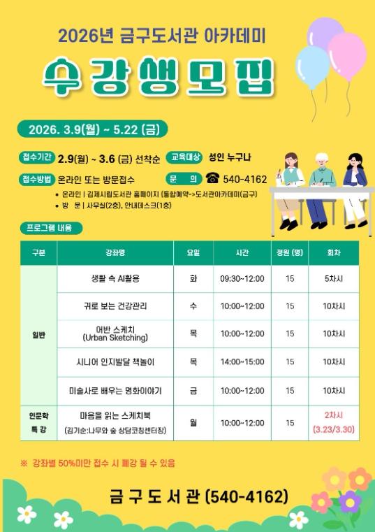 [중앙뉴스라인, 김용범기자] 김제시 금구도서관은 지역 주민들의 자기 계발과 문화 향유 기회를 확대하기 위해 2026년 금구도서관 아카데미 수강생을 오는 3월 6일까지 선착순 모집한다고 밝혔다.