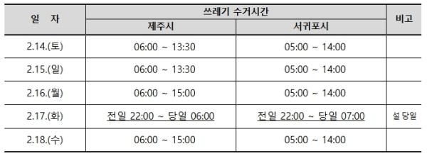 임홍철 제주도 기후환경국장은 “설 연휴에도 쓰레기 처리와 관련한 불편을 최소화하고 깨끗한 환경을 유지하기 위해 최선을 다하겠다”며 “쓰레기 줄이기와 올바른 분리배출 등 도민 여러분의 적극적인 협조를 당부드린다”고 밝혔다.