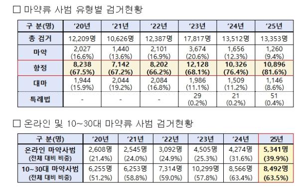 신종 마약류의 대다수에 해당하는 향정신성의약품은 검거 인원이 ’24년 10,326명(76.4%)에서 ’25년 10,896명(81.6%)으로 증가, 압수량은 ’24년 381kg에서 ’25년 448kg으로 증가했으며, 최근 급성장한 온라인 마약 유통시장을 통해 젊은 연령층으로 빠르게 확산하고 있다.