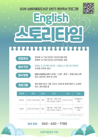 [중앙뉴스라인, 김용범기자] 남원어울림도서관은 지난해에 이어 유아 및 초등학생을 대상으로 2026년 영어 독서프로그램 ‘English 스토리 타임’을 운영한다.