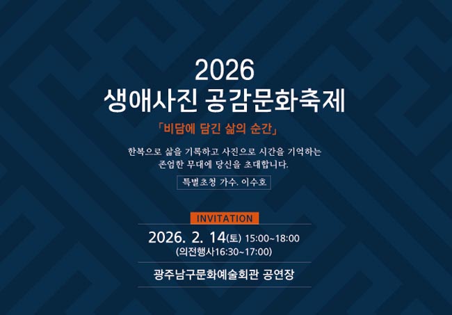 [중앙뉴스라인 = 전은희 기자] 광주 남구문화예술회관에서 오는 2월 14일 오후 3시부터 ‘2026 생애사진 공감문화축제’가 열린다. 이번 축제는 ‘비담에 담긴 삶의 순간’을 주제로, 어르신들의 생애사진을 기록하고 전시하며 전통문화 공연을 통해 세대 간 공감과 소통을 나누는 뜻깊은 행사다.