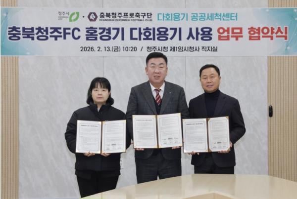 [중앙뉴스라인, 양병남기자] 청주시는 13일 충북청주 프로축구단(충북청주FC), 다회용기 공공세척센터와 함께 충북FC 홈경기 다회용기 사용 확대를 위한 업무협약을 체결했다.