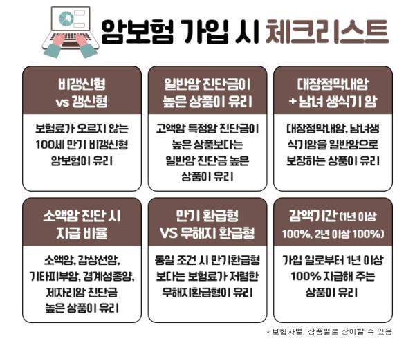 우선, 암보험을 가입하기 위해서는 갱신형 상품과 비갱신형 상품중에서 선택을 해야 한다. 갱신형은 처음 가입 시에는 보험료가 상대적으로 저렴하지만 갱신을 이어가면서 보험료가 계속 인상될 수 있고, 비갱신형은 초기 보험료는 갱신형보다 높을 수 있지만, 가입 후에 보험료인상이 없어 안정적으로 유지관리가 가능한 장점이 있다. 따라서 이러한 장단점을 고려하여 본인의 상황에 맞게 선택하는 것이 좋다.