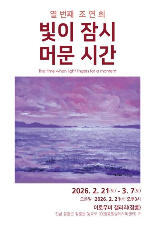 [중앙뉴스라인, 전은희기자] 찰나의 빛이 머무는 바다의 풍경을 통해 내면의 그리움과 치유를 노래하는 조연희 작가의 개인전 '빛이 잠시 머무는 시간'이 오는 2월 21일부터 3월 7일까지 장흥읍 소재 ‘이로우미 갤러리’에서 열린다.
