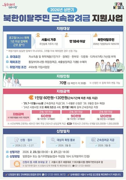 신청 대상은 주민등록 주소지가 서울인 만 18세 이상 북한이탈주민이며, 소득은 2026년 기준중위소득 기준 150% 이하여야 한다. 근속 1년 이상은 월 10만 원, 근속 3년 이상은 월 15만 원, 근속 5년 이상은 월 20만 원씩 최대 4회(2년, 반기별 1회 선정·지급) 지급할 계획이다.