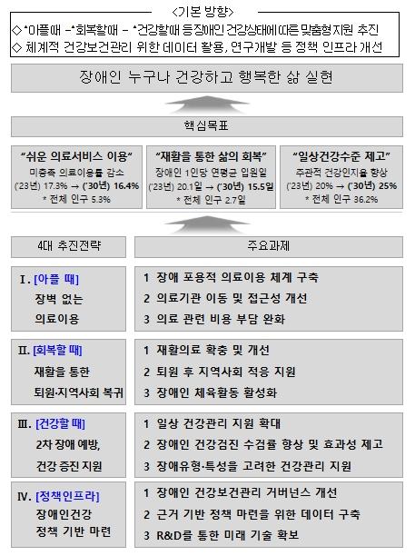 이에 정부는 장애인단체, 의료전문가 등 이해관계자의 의견수렴을 거쳐, ▲장벽 없는 의료이용, ▲재활을 통한 퇴원·지역사회 복귀, ▲2차 장애 예방, 건강 증진 지원, ▲장애인건강 정책 기반 마련을 중점전략으로 하여 12대 주요과제 및 32개 세부 추진과제를 제시했다.
