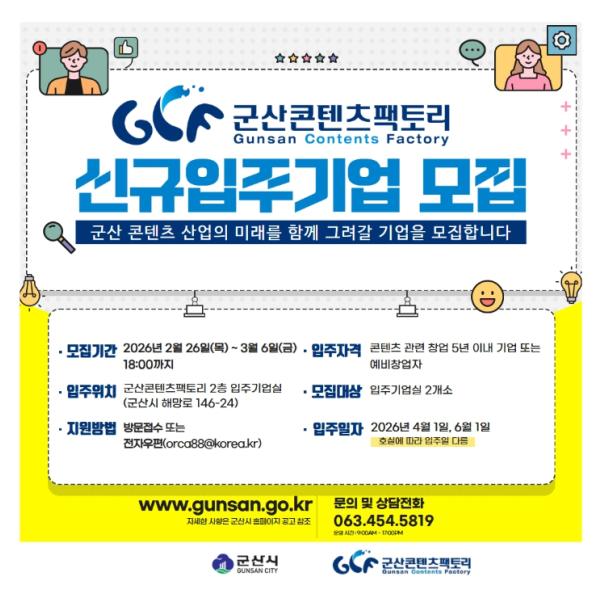 [중앙뉴스라인, 김용범기자] 군산시가 콘텐츠 산업 창업 활성화 및 지역 기업 육성을 위해 군산콘텐츠팩토리 신규 입주기업 2개사를 모집한다.