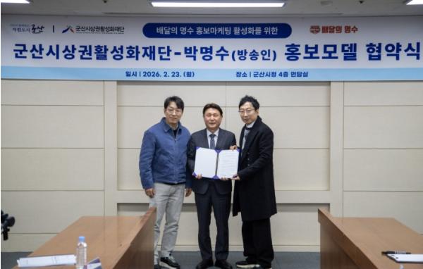 [중앙뉴스라인, 김용범기자] 군산시상권활성화재단은 2월 23일 시청 상황실에서 군산 출신 개그맨 박명수와 공공배달앱 ‘배달의 명수’ 홍보모델 업무협약을 체결했다.