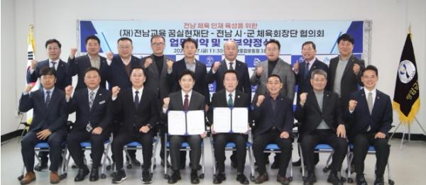 (재)전남교육 꿈실현재단과 전라남도 시·군 체육회장단 협의회(회장 이상대)가 지난 2월 27일 영암종합운동장 회의실에서 전남 체육 인재 육성을 위한 업무협약을 체결했다.