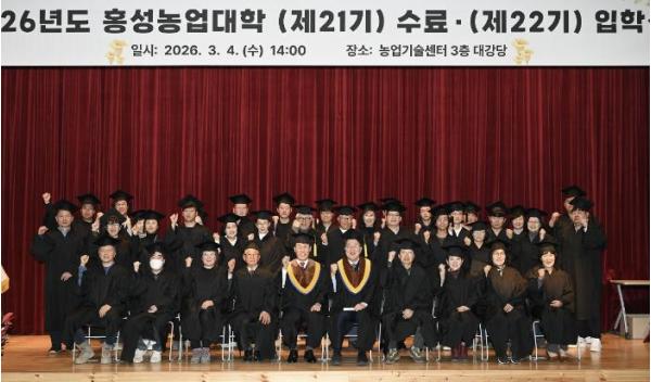 홍성군은 4일 농업기술센터 3층 대강당에서 ‘2026년도 홍성농업대학 제21기 수료 및 제22기 입학식’을 개최했다고 밝혔다.