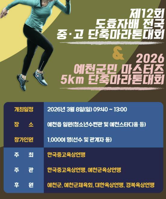 [중앙뉴스라인, 우제헌기자] 예천군은 오는 8일 오전 10시부터 예천읍 일원에서 '제12회 예천 도효자배 전국 중·고 단축마라톤대회' 및 '2026 예천군민 마스터즈 단축마라톤대회'를 개최한다고 밝혔다.