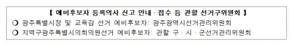 또한, 「공직선거법」 제53조 제1항에 따른 공무원 등은 3월 5일까지 사직해야 공직선거에 입후보가 가능하나, 광주특별시 시장 및 교육감 선거에 입후보하려는 공무원 등은 특별법에 따라 3월 15일까지 사직하면 입후보가 가능하다.