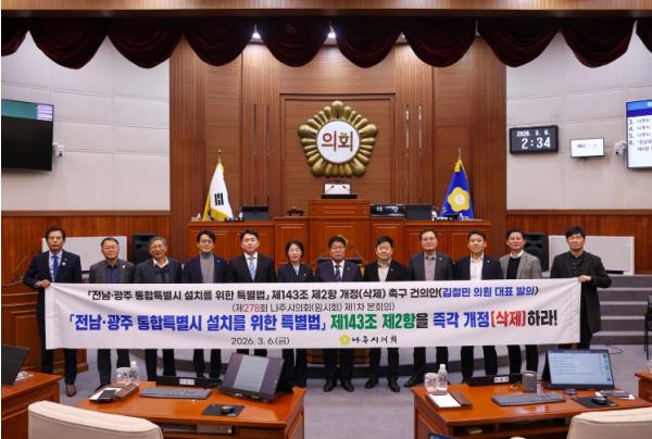 [중앙뉴스라인, 전은희기자] 나주시의회는 3월 6일 제278회 임시회 제1차 본회의를 열고 ''전남광주통합특별시 설치를 위한 특별법' 제143조 제2항 삭제 촉구 건의안'을 채택했다.