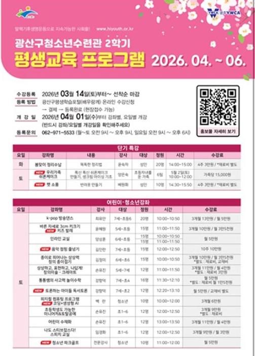 [중앙뉴스라인 = 전은희 기자] 광주 광산구청소년수련관(관장 김신영)은 오는 2026년 4월 1일부터 6월 30일까지 12주간 진행되는 2학기 평생교육 프로그램 수강생을 모집한다고 밝혔다. 이번 프로그램은 지역 주민의 역량 강화와 평생교육 문화 확산을 목표로, 디지털·문화예술·생활기술을 아우르는 다양한 강좌로 구성됐다.