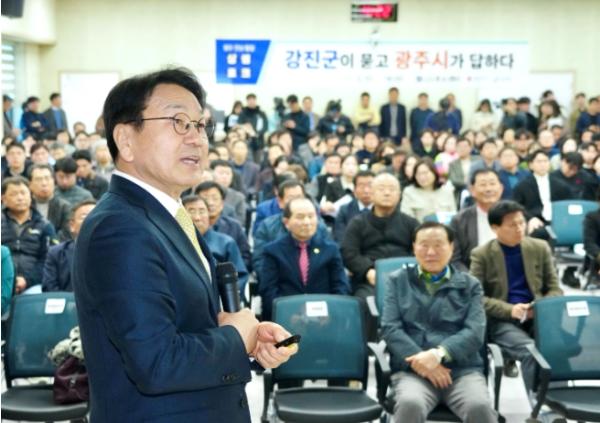 상생토크는 광주전남 통합에 대해 전남 시군민들과 직접 소통하기 위해 마련된 자리로, 이날 행사에는 강기정 광주시장, 강진원 강진군수, 군민 등 200여명이 참석했다.