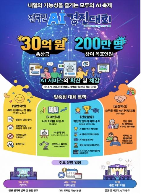 「전국민 AI 경진대회」는 3월 26일(목) 개최되는 국민이 참여하는 개막식을 통해 공식 시작을 알리고, 4월부터 11월까지 대회를 운영한 뒤 연말 개최되는 AI 페스티벌을 통해 총 상금 30억원 규모로 우수 성과를 시상할 계획이다.