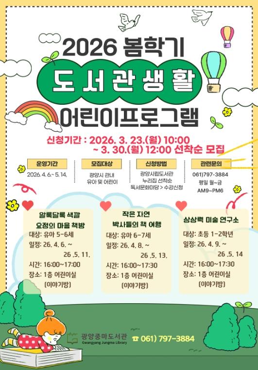 [중앙뉴스라인, 전은희기자] 광양중마도서관은 오는 4월 6일부터 5월 14일까지 6주간 유아(5~7세)와 초등학교 1~2학년을 대상으로 봄 학기 어린이 프로그램에 참여할 수강생을 모집한다고 밝혔다.