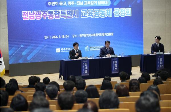 [중앙뉴스라인, 김민수기자] 전라남도교육청‧광주광역시교육청은 18일 광주교육청 시민협치진흥원 대강당에서 지역 주민 의견 수렴을 위한 ‘전남광주통합특별시 교육공동체 공청회’를 개최했다.