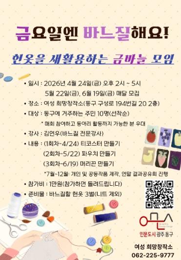 모집 대상은 동구에 주소를 둔 주민 10명(선착순)이며, 세 차례 모두 참여하고 이후 동아리 활동까지 가능한 주민을 우대한다. 참가비는 1인당 1만 원으로, 프로그램 종료 후 전액 환급된다. 준비물은 바느질에 사용할 헌옷 3벌(니트류 제외)이다.