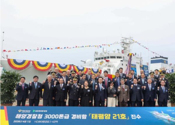 [중앙뉴스라인, 양병남기자] 해양경찰청은 4월 1일, 울산광역시 동구에 소재한 HD현대중공업㈜에서 3000톤급 신형 경비함 태평양 21호(3021함)의 진수식을 개최했다.
