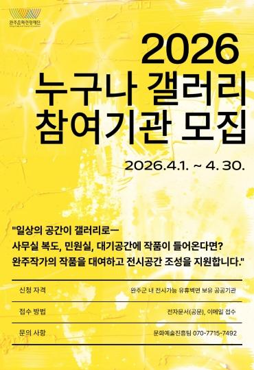 (재)완주문화관광재단은 관내 소장품을 활용하여 군민들의 일상 생활권 내 전시 활성화를 도모하는 '2026 누구나 갤러리 : 완주 작가 작품 대여‧전시'참여기관을 오는 4월 30일까지 모집한다고 밝혔다.