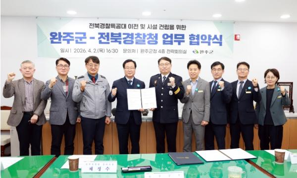 [중앙뉴스라인, 김용범기자] 완주군과 전북경찰청은 2일 완주군청 전략회의실에서 경찰특공대 이전 및 청사 신축을 위한 업무협약(MOU)을 체결하고 전북 경찰특공대 이전 사업을 본격적으로 추진하기로 했다.