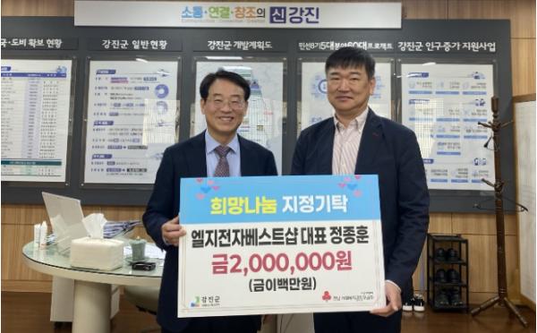 [중앙뉴스라인, 전은희기자] 정종훈 LG전자 베스트샵 강진점 대표가 지난 2일 지역 어르신들을 위한 이웃돕기 성금 200만 원을 기탁하며 나눔 문화에 앞장서고 있다.
