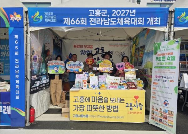 [중앙뉴스라인, 이상권기자] 고흥군은 제65회 전라남도체육대회가 열린 구례군 공설운동장에서 고향사랑기부제 홍보부스를 운영하며 기부 참여 확산에 나서, 4월 10일부터 13일까지 4일간 진행된 현장 홍보를 성황리에 마무리했다고 밝혔다.