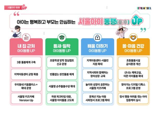 서울시가 양육가정, 특히 맞벌이 가구가 아이돌봄 고민 때문에 직장을 그만두거나 일·생활 균형을 포기하지 않도록, 기존 아이돌봄 체계를 한 단계 업그레이드한 '서울아이 동행(童幸) UP 프로젝트'를 발표했다.