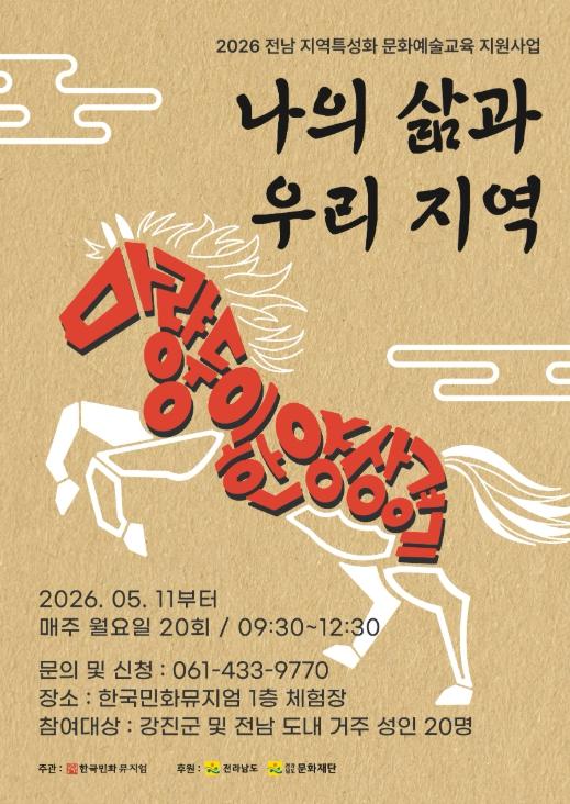 [중앙뉴스라인, 전은희기자] 강진군 대구면에 있는 한국민화뮤지엄이 ‘2026 지역특성화 문화예술교육 지원사업’ 선정에 따라 오는 5월 11일부터 ‘나의 삶과 우리 지역–마량둥이의 한양 상경기’ 프로그램 운영을 시작하며 참가자를 모집한다.