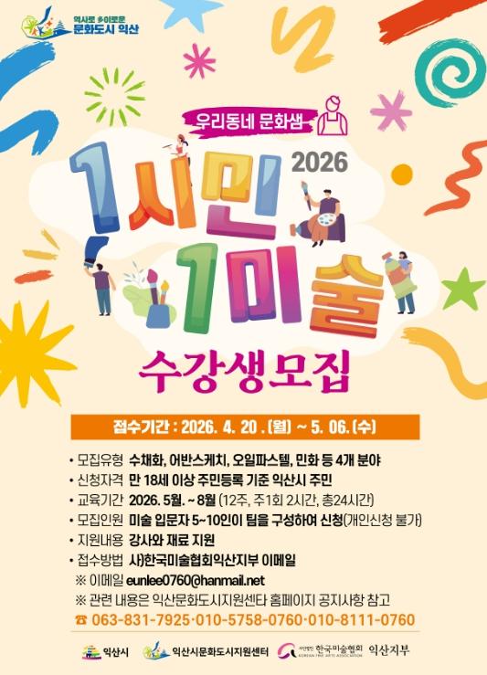 시는 익산시문화도시지원센터와 함께 오는 20일부터 5월 6일까지 '1시민 1미술'에 참여할 25팀을 모집한다.