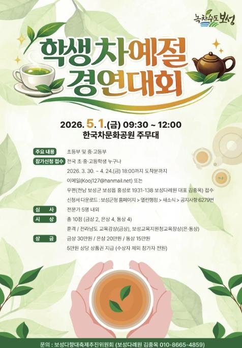 [중앙뉴스라인, 전은희기자] 보성군은 오는 24일 18시까지 ‘2026 학생차예절경연대회’에 참가할 전국 초·중·고등학생을 모집한다고 밝혔다.