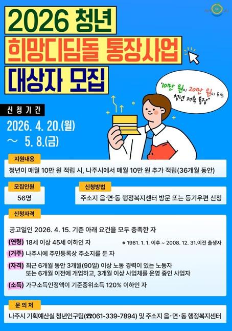 나주시는 2026년 청년 희망디딤돌 통장사업 신규 참여자 56명을 오는 5월 8일까지 모집한다고 17일 밝혔다.
