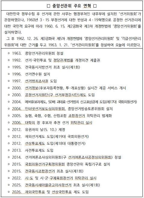 노태악 위원장은 “우리 위원회는 3·15 부정선거에 대한 반성과 4·19 민주이념을 기반으로 1963년 창설된 이래 헌법이 부여한 책무를 충실히 수행하기 위해 계속 노력해왔다”면서, “이번 지방선거도 공정한 선거관리를 바라는 국민의 눈높이에서 차질 없이 관리하기 위하여 더욱 철저히 준비하겠다”라고 밝혔다.