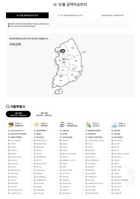 시·도를 선택하면 해당 지역의 주요 관심 주제(‘토픽’) 5개와 각 주제별 주요 키워드 20개가 함께 제시되어 총 100개의 공약이슈를 확인할 수 있고, 구·시·군을 선택하면 3개 토픽과 토픽별 20개의 키워드를 통해 총 60개 공약이슈를 볼 수 있다.