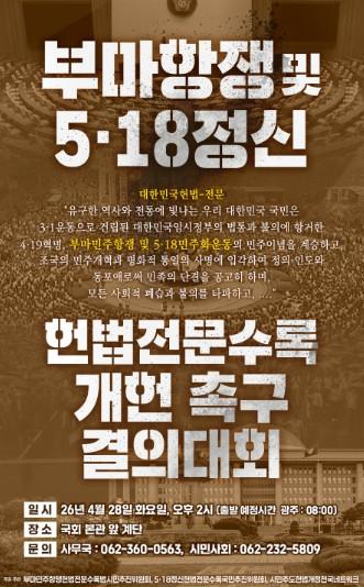 [중앙뉴스라인, 양병남기자] 광주광역시는 오는 28일 오후 2시 국회 본관 앞에서 개헌안 가결을 위한 정치권의 결단을 촉구하는 ‘부마항쟁 및 5·18정신 헌법 전문 수록 개헌 촉구 국민결의대회’가 열린다고 밝혔다.